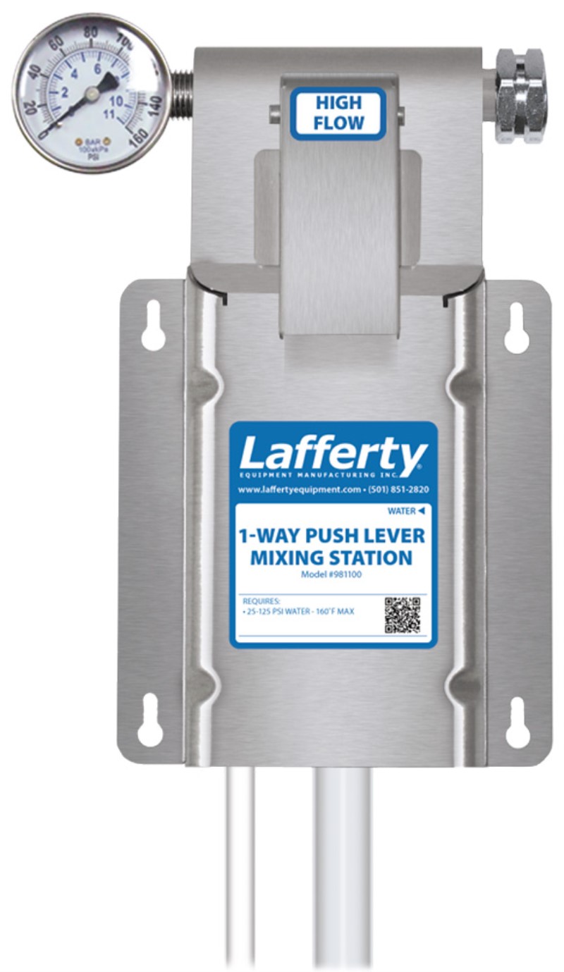 Lafferty chemical mixing stations are widely recognized as offering the highest quality construction and most dependable performance. This mixing station will consistently dispense cleaning solutions diluted to precise chemical ratios in three standard flow rate options: