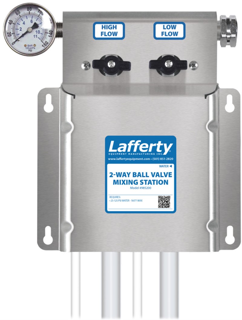 Lafferty chemical mixing stations are widely recognized as offering the highest quality construction and most dependable performance. This mixing station will consistently dispense cleaning solutions diluted to precise chemical ratios in three standard flow rate options: