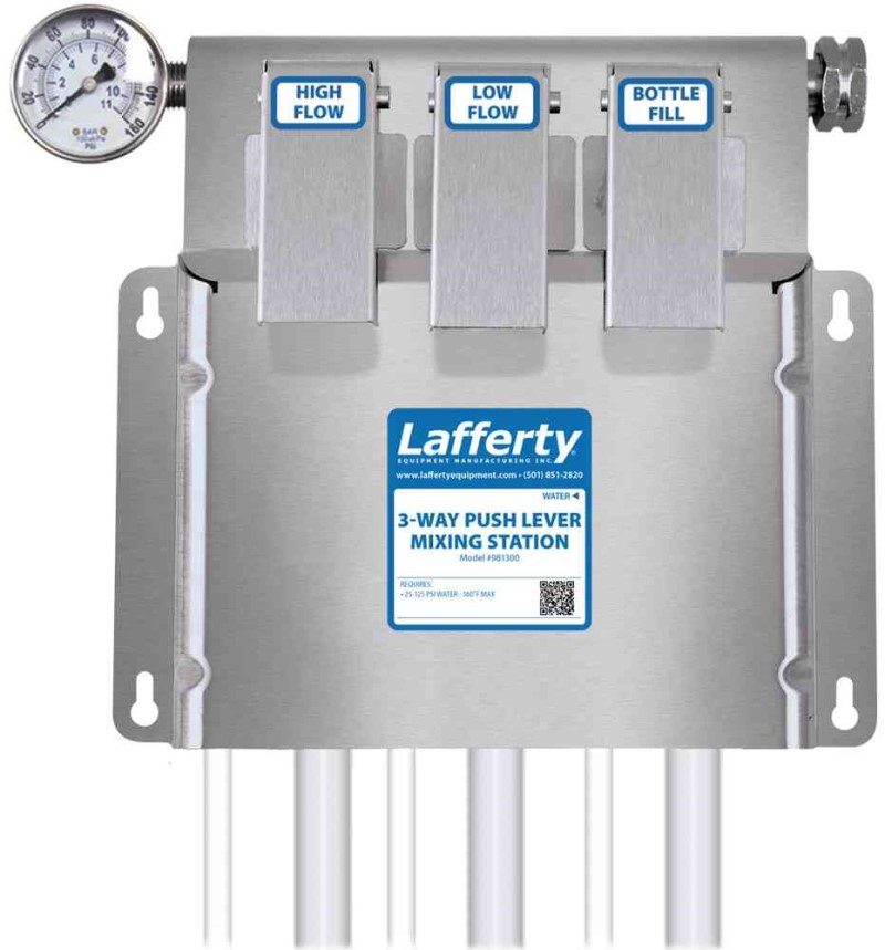 Lafferty chemical mixing stations are widely recognized as offering the highest quality construction and most dependable performance. This mixing station will consistently dispense cleaning solutions diluted to precise chemical ratios in three standard flow rate options: