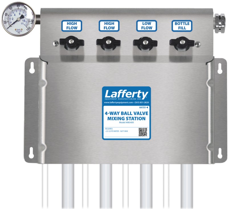Lafferty chemical mixing stations are widely recognized as offering the highest quality construction and most dependable performance. This mixing station will consistently dispense cleaning solutions diluted to precise chemical ratios in three standard flow rate options: