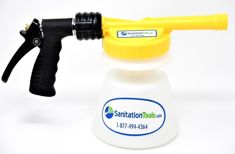 HydroFoamer 483 Yellow Lid hose end proportioners combine automatic dilution with convenient control of where and how solution is applied. The HydroFoamer 483 provides a thick, rich foam for more "cling" time on the surface being cleaned. The HydroFoamer 483 provides an excellent way to apply cleaners/sanitizers/disinfectants at metered dilutions. On and off functions are controlled using a trigger on the spray gun. To rinse, the concentrate container is disconnected via a quick coupler.